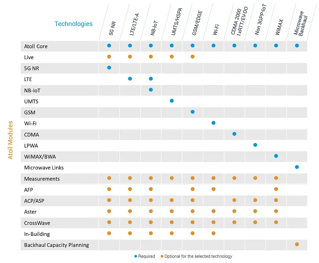 Atoll is designed with a modular architecture that allows operators and engineering teams to build a planning environment tailored to their needs. Each module adds specialised functionality—from radio and transmission planning to automation and optimisation—making Atoll one of the most flexible and scalable network design tools in the industry.