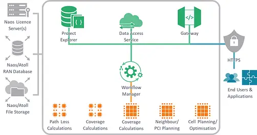 It is capable of processing large amounts of radio access network and geographic data, and performing large-scale complex calculations, controlled by a set of workflow management tools, or enterprise applications through powerful REST APIs and services.